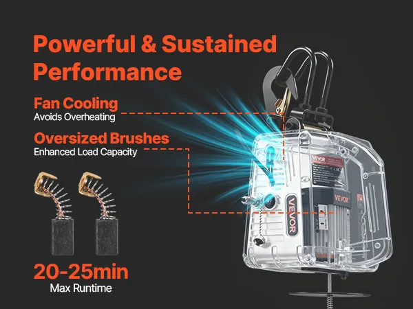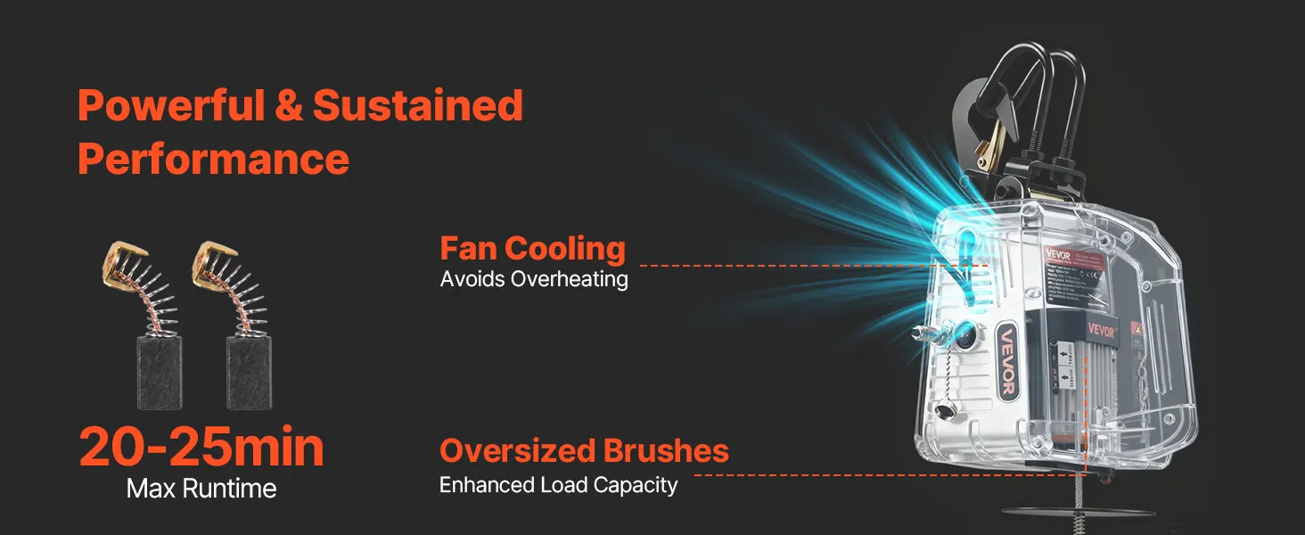 Motore durevole e affidabile: questa gru elettrica con argano utilizza un motore da 1500 W con raffreddamento a ventola forzata e spazzole di carbone più grandi. Il design aiuta a fornire una potenza costante
