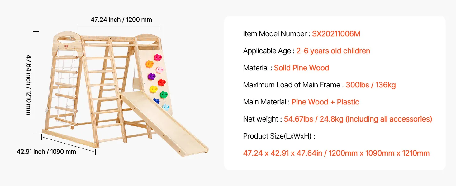 VEVOR Palestra da Interno, Parco Giochi per Bambini, 109 x 120 x 119,5 cm, con Scala in Legno e Corda, Scala a Rete, Altalena, Barra di Scimmia, Scivolo, Parete da Arrampicata, Giocattoli in Legno