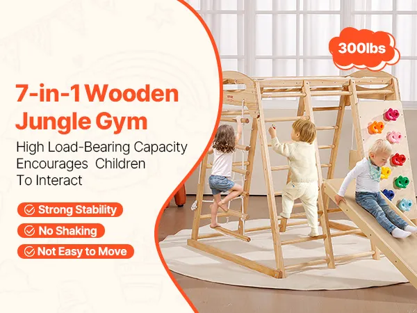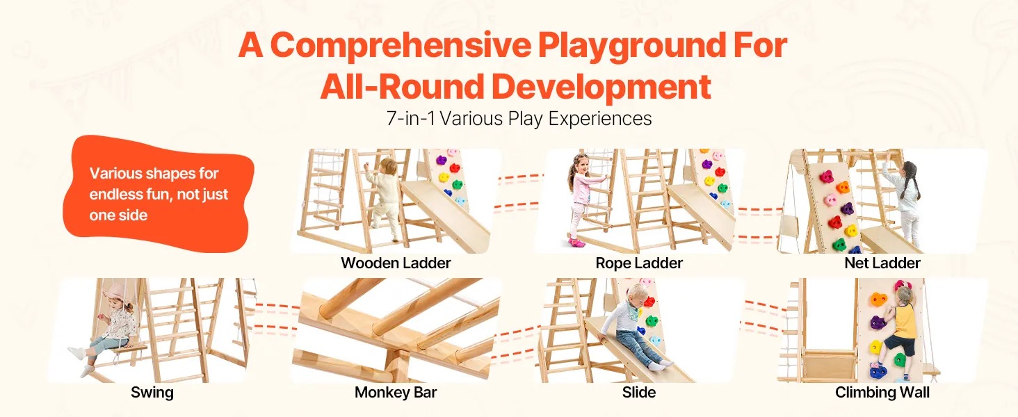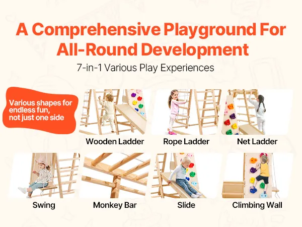 Parco giochi 7 in 1 per un divertimento senza fine: il nostro parco giochi al coperto include una scala in legno, una scala di corda, una scala a rete, un'altalena, una struttura di gioco, uno scivolo e una parete da arrampicata, tutto in un unico set