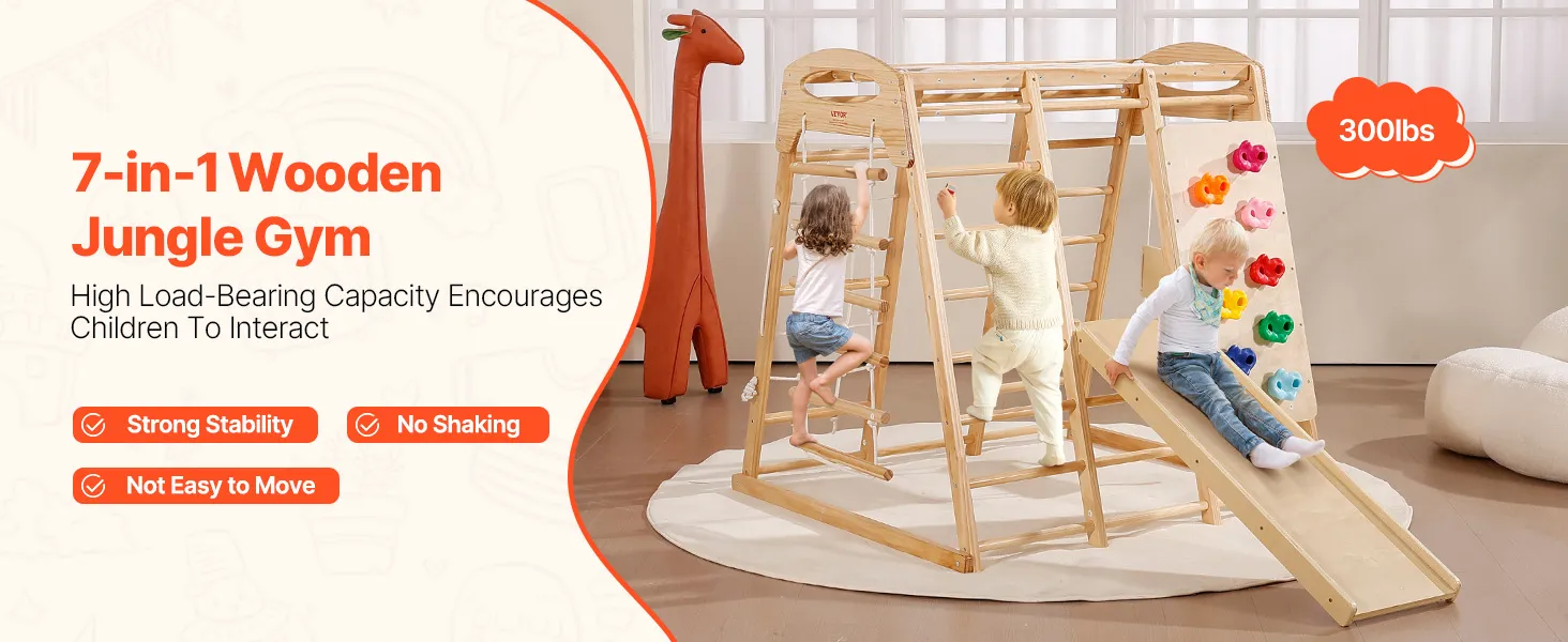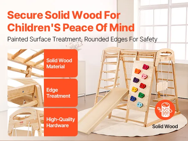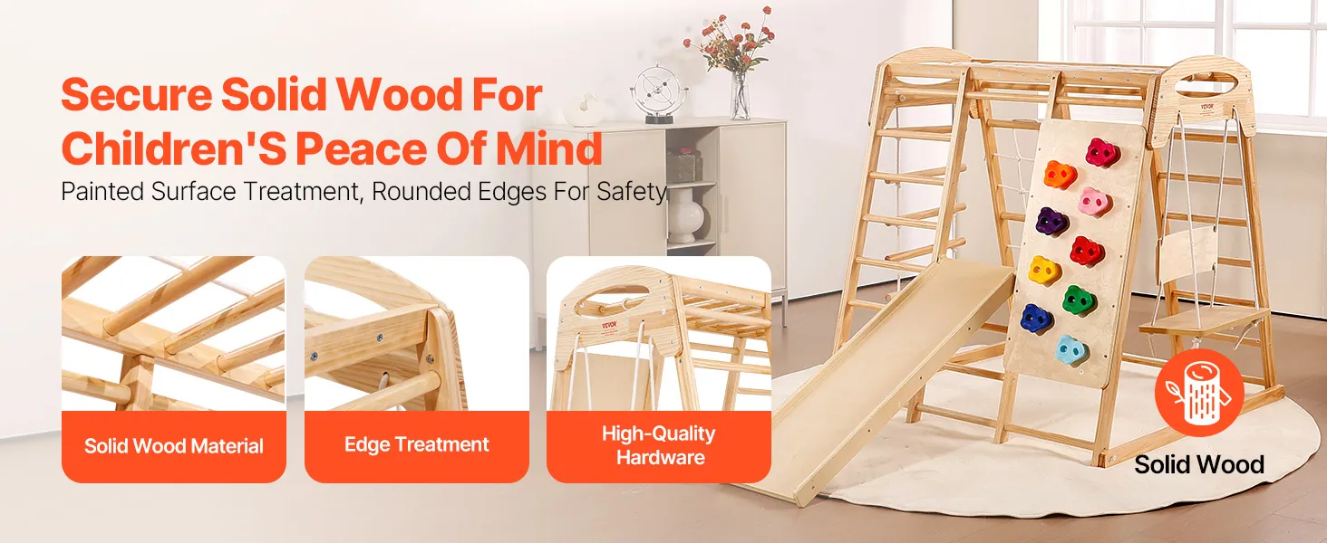 Realizzata in legno massello di alta qualità, la nostra palestra per bambini offre uno spazio di gioco sicuro e facile da pulire. Ogni pezzo presenta bordi lisci e arrotondati e una finitura accuratamente verniciata per evitare graffi e lesioni durante il gioco.