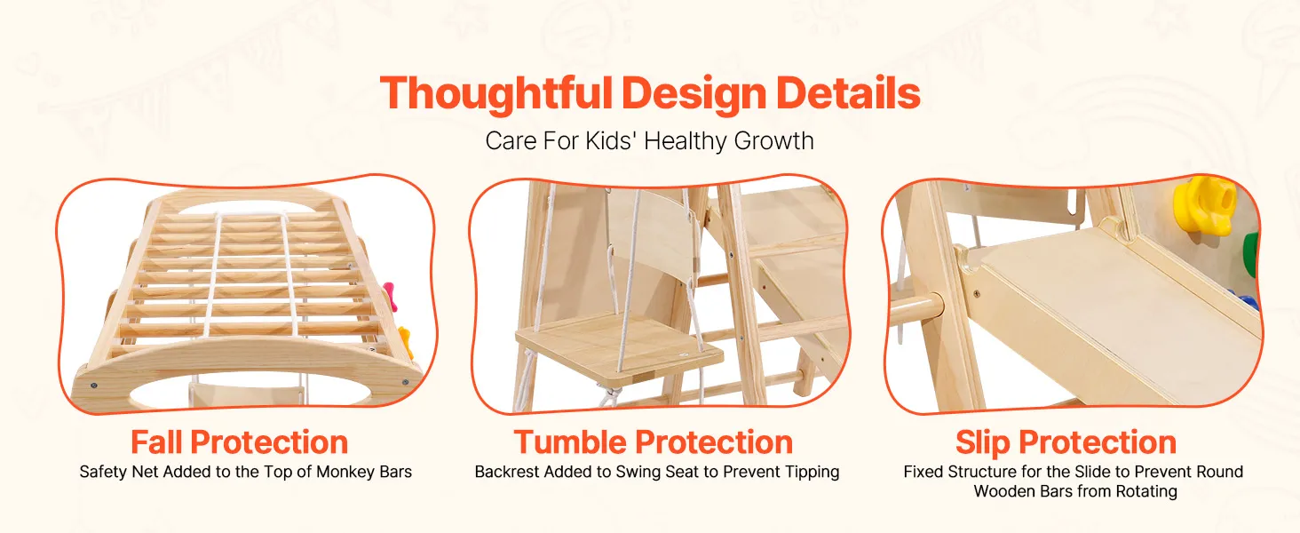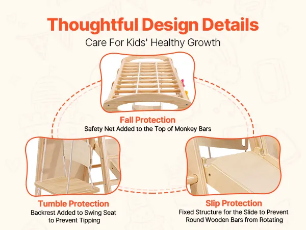 Ogni dettaglio è progettato pensando alla sicurezza del tuo bambino. Una rete sopra le barre di sicurezza aiuta a evitare cadute accidentali, mentre lo schienale dell'altalena aggiunge stabilità e riduce il rischio di ribaltamento, così i bambini possono giocare in sicurezza.