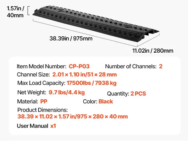Realizzata in polipropilene leggero ma resistente, questa rampa di protezione per cavi è facile da trasportare, posizionare e installare, senza emanare odori sgradevoli. Supporta fino a 8.000 kg/asse, resistendo anche al traffico di veicoli pesanti. Il design a doppio canale consente di far passare due cavi separati senza che si aggroviglino.