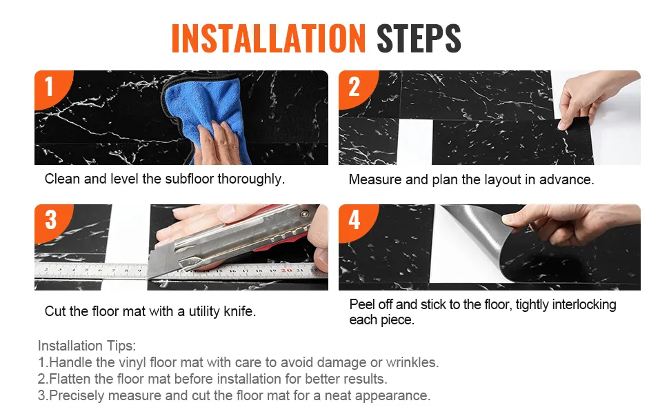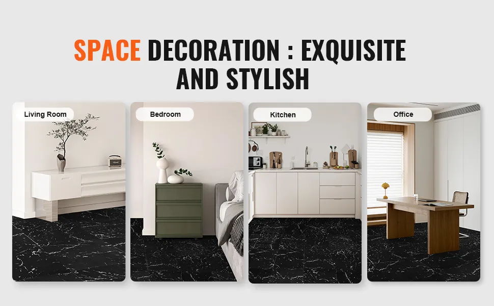 Queste piastrelle in vinile per pavimenti da cucina sono una scelta finanziaria intelligente. Offrono una soluzione economica per l'arredamento della casa senza sacrificare qualità o stile. Le piastrelle sono convenienti e facili da installare, riducendo la necessità di costosi interventi professionali. La loro durata significa che non dovrai sostituirle spesso, risparmiando denaro a lungo termine. L'elegante texture in marmo nero aggiunge valore alla tua casa, facendola sembrare più costosa di quanto non sia. Questa combinazione di convenienza e stile rende queste piastrelle un ottimo investimento per la tua casa.