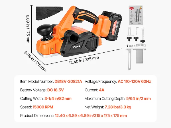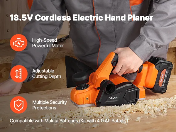VEVOR Cordless Handheld Planer, 82 mm Cut Width, 15000 RPM Electric Hand Wood Planer with 4 Ah 18V Lithium Battery, Brushless Motor, Adjustable Cut Depth, Dust Collection Bag, for Woodworking VEVOR Cordless Handheld Planer, 82 mm Cut Width, 15000 RPM Electric Hand Wood Planer with 4 Ah 18V Lithium Battery, Brushless Motor, Adjustable Cut Depth, Dust Collection Bag, for Woodworking