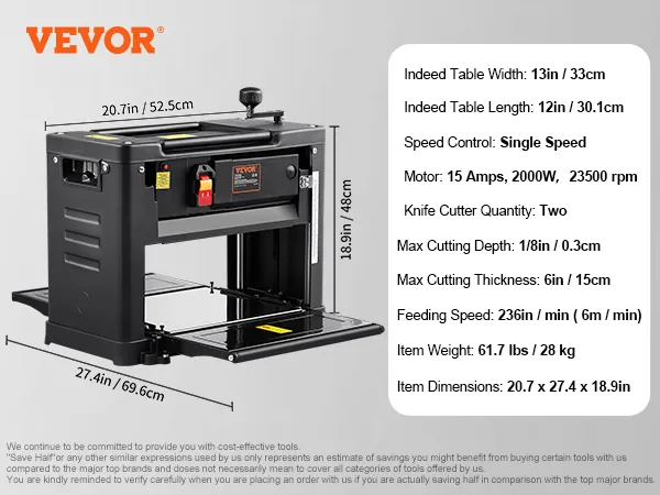 Lavora con la pialla a filo a spessore di VEVOR a tre coltelli a due velocità con il piano di lavoro da 33cm, alimentata da un motore di 15 Amp. Questa pialla portatile con funzionalità multipla semplifica la creazione di legno personalizzati in modo migliore.