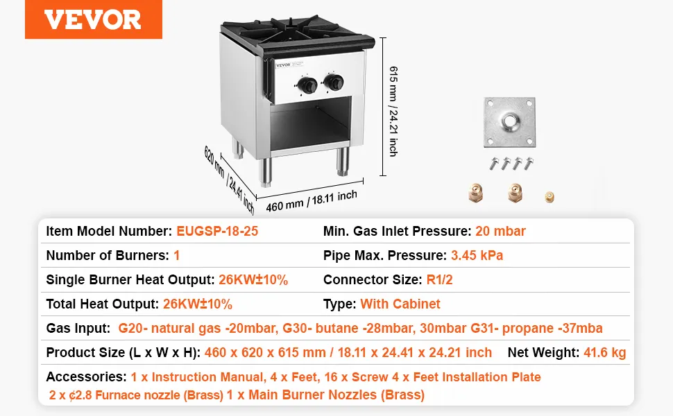 Calore potente: fornello a gas commerciale professionale da 26 kW per una cottura veloce e pasti deliziosi. Presenta un bruciatore in ghisa ispessita per fiamme stabili e durevoli, ideale per cotture prolungate.