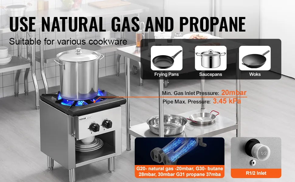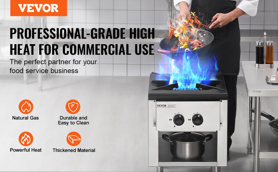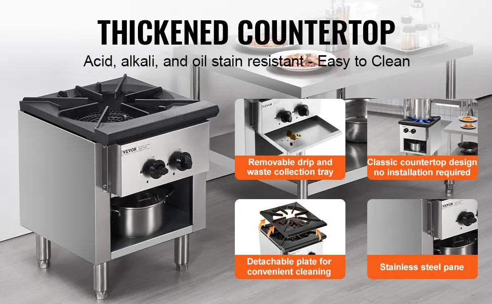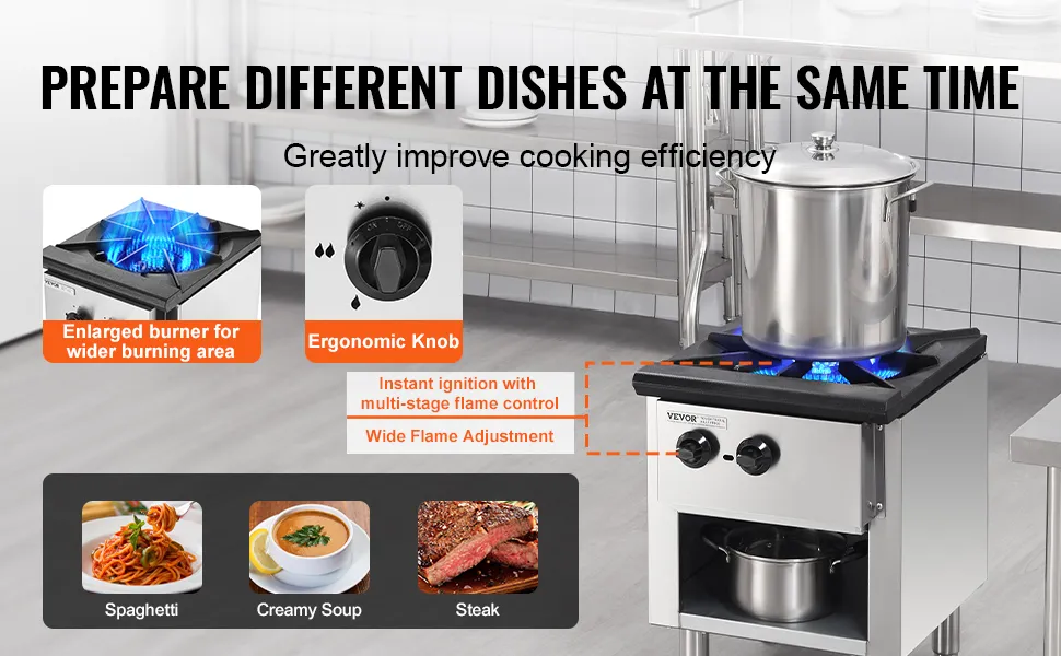 La cucina a gas commerciale è dotata di una manopola ergonomica per un'ampia regolazione della fiamma. Scegli la fiamma desiderata, accendila all'istante e usa la manopola ergonomica per un controllo senza sforzo. Cucina una varietà di piatti con facilità.
