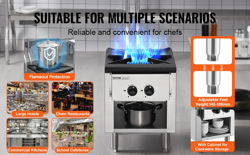 Ampia applicazione: installazione flessibile senza fori; basta collegarsi al gas e iniziare a usare. Dispone di un mobiletto portaoggetti per un facile accesso a stoviglie e condimenti. Ideale per cucine commerciali, mense scolastiche, grandi hotel, mense aziendali.