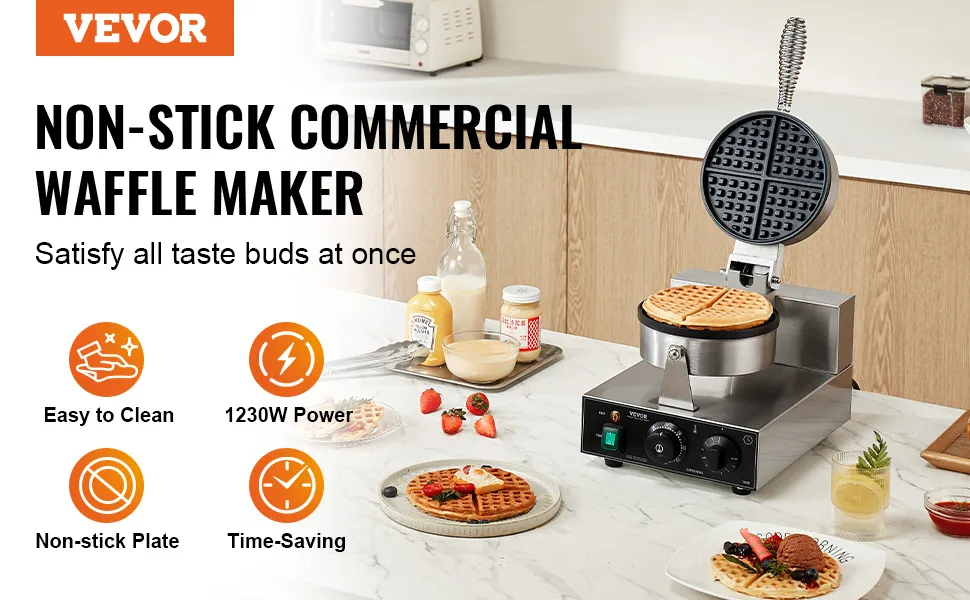 VEVOR Macchina per Waffle Belga Rotonda Commerciale Macchina Waffle 1230 W, Piastra Waffle Belga in Acciaio Inox Antiaderente, con Controllo Temperatura Tempo, Maniglia, per Ristoranti, Panetterie