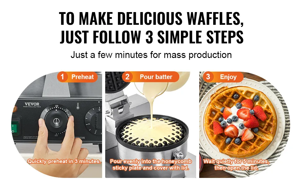 Puoi usare questa macchina per waffle per preparare deliziosi dessert a base di waffle per la tua pasticceria, soddisfacendo la colazione o il tè pomeridiano di tutti. Con il suo design unico del pannello, si distingue, rendendolo la scelta migliore per il tuo stand di snack.