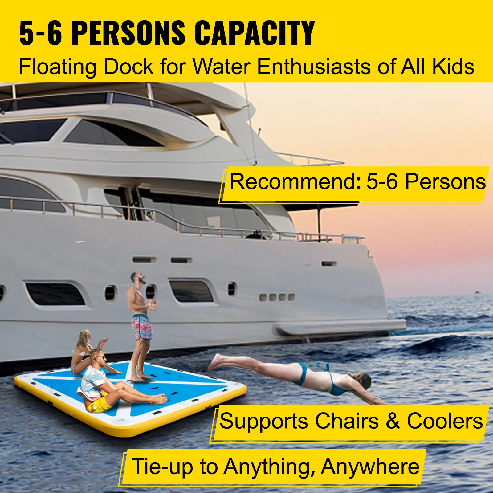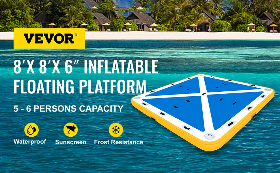 Il molo gonfiabile offre una lussuosa piattaforma da bagno estesa 8 piedi x 8 piedi. È progettato per darti spazio aggiuntivo per rilassarti, nuotare e rilassarti. È spesso 6 pollici per garantire la stabilità.