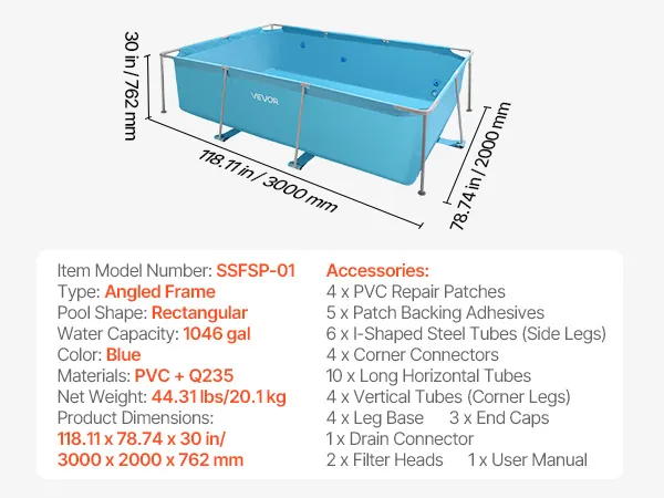 VEVOR Piscina Fuori Terra Rettangolare con Struttura in Metallo, 3 x 2 x 0,76 m, Piscina Rettangolare in PVC per Famiglie, Capacità Acqua 3959 L, con Sistema di Drenaggio a Flusso Controllato, Blu