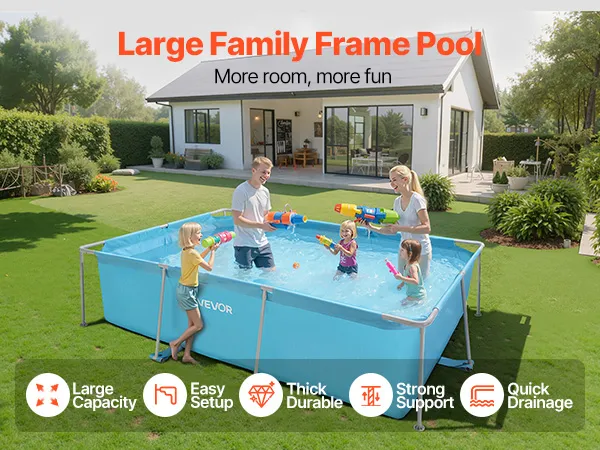 Facile installazione e stoccaggio: posizionare la piscina in piano, montare la struttura e riempirla d'acqua. Dopo l'uso, smontare la piscina rettangolare fuori terra e ripiegarla per riporla facilmente