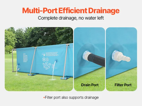 La nostra piscina fuori terra è dotata di un sistema di drenaggio multiforo per un drenaggio rapido e completo dell'acqua. Questo previene il ristagno dell'acqua, riduce la crescita di alghe e ne facilita lo svuotamento.