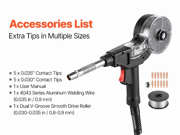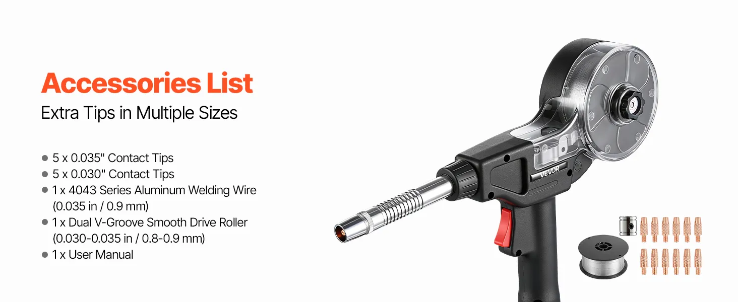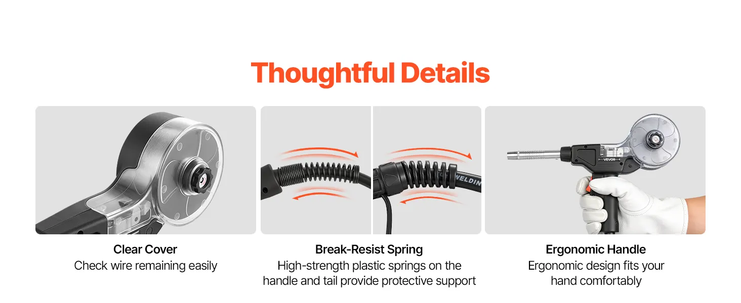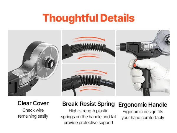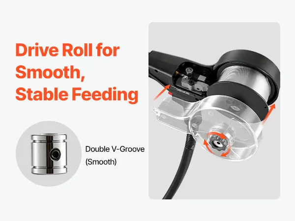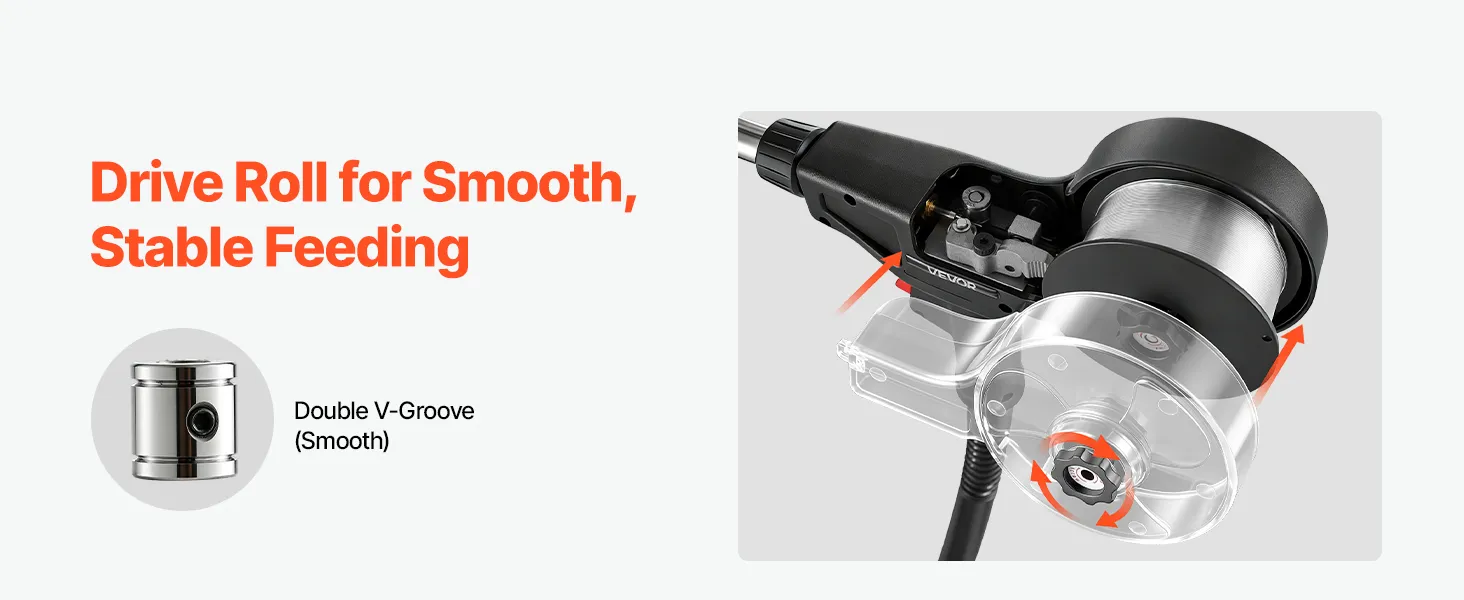 Alimentazione del filo fluida e stabile: Dotata di un rullo di trascinamento a doppia scanalatura a V da 0,8-0,9 mm per garantire un'alimentazione uniforme e fluida, e l'impugnatura ergonomica si adatta comodamente alla mano per un maggiore controllo e un funzionamento stabile
