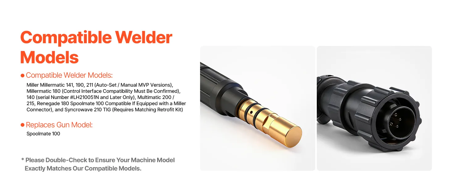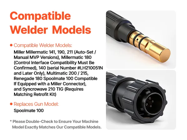 Modelli di saldatrici compatibili: Millermatic 141, 190, 211 (versioni MVP con impostazione automatica/manuale), 180 (è necessario verificare la compatibilità dell'interfaccia di controllo), 140 (dopo il modello #LH210051N), Multimatic 200/215, Renegade 180 (con connettore tipo Miller o Spoolmate 100) e Syncrowave 210 TIG (richiede il kit di retrofit corrispondente)