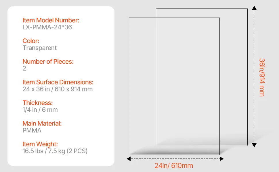 Ogni foglio misura 24 x 36 pollici, 1/4 di pollice (6 mm) di spessore ed è realizzato in materiale PMMA di prima qualità con MMA puro al 100% per un'eccellente trasparenza e resistenza. Facile da tagliare, forare o piegare a caldo, è ideale per lavori fai da te, cartelli per matrimoni.