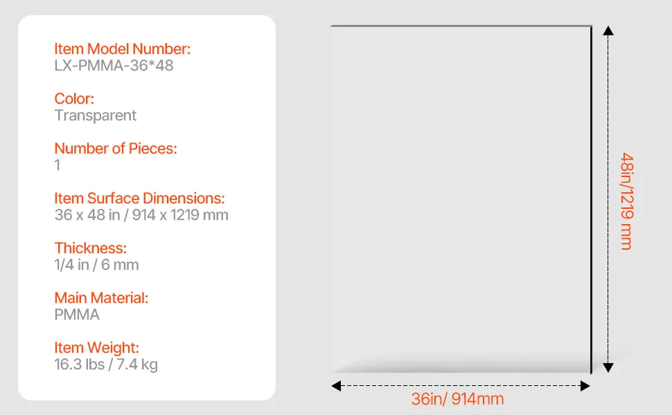 Ogni foglio misura 36 x 48 pollici, 1/4 in (6 mm) di spessore ed è realizzato in materiale PMMA di prima qualità con MMA puro al 100% per un'eccellente trasparenza e resistenza. Facile da tagliare, forare o piegare a caldo, è ideale per lavori fai da te, cartelli per matrimoni.