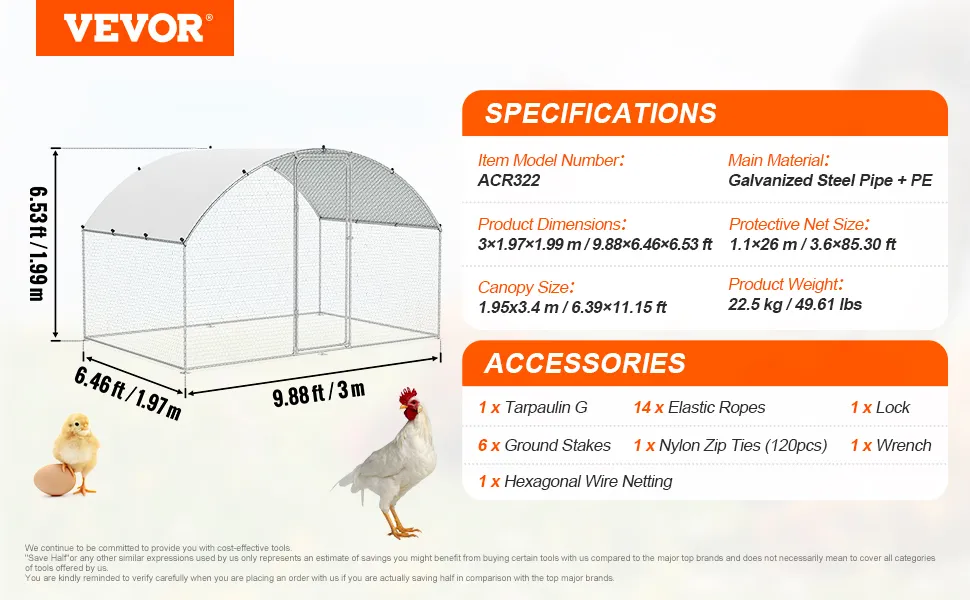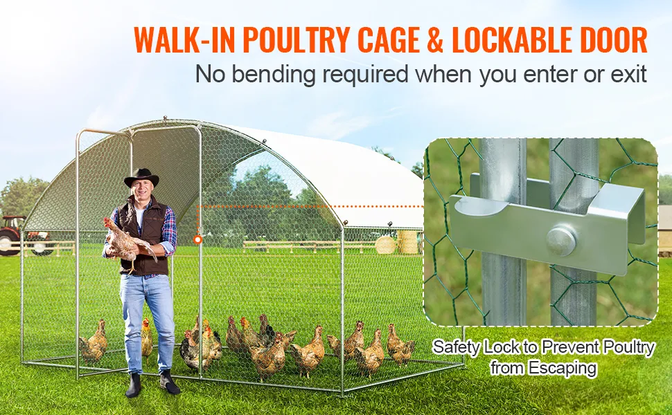 Il pollaio VEVOR è semplice da installare. Il telaio in acciaio zincato è facile da montare. È robusto e costruito per durare. Il processo di assemblaggio richiede un numero minimo di utensili. Puoi installarlo in poche ore con semplici istruzioni. Il design del telaio garantisce stabilità e durata. L'acciaio zincato offre resistenza alla ruggine per un uso a lungo termine. Ciò lo rende una scelta affidabile per ospitare il tuo pollame. Il facile assemblaggio ti fa risparmiare tempo e fatica. La robusta costruzione di questa cappa per polli le consente di resistere a difficili ambienti esterni.