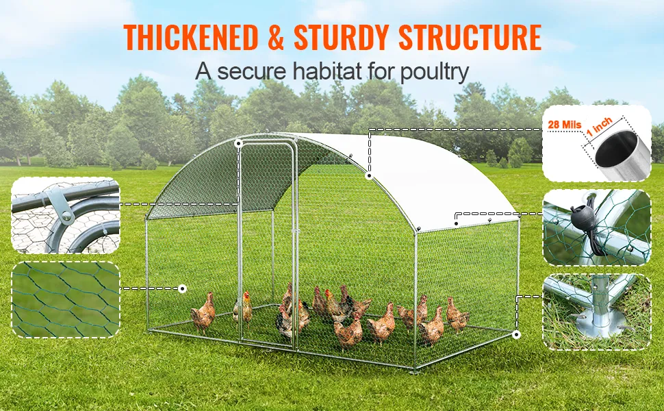 Resistente alle intemperie e alla corrosione: realizzato con tubi in acciaio zincato e rigorosamente testato contro la nebbia salina, questo grande pollaio resiste a condizioni atmosferiche avverse come pioggia, vento ed esposizione al sole, garantendo stabilità e sicurezza a lungo termine.