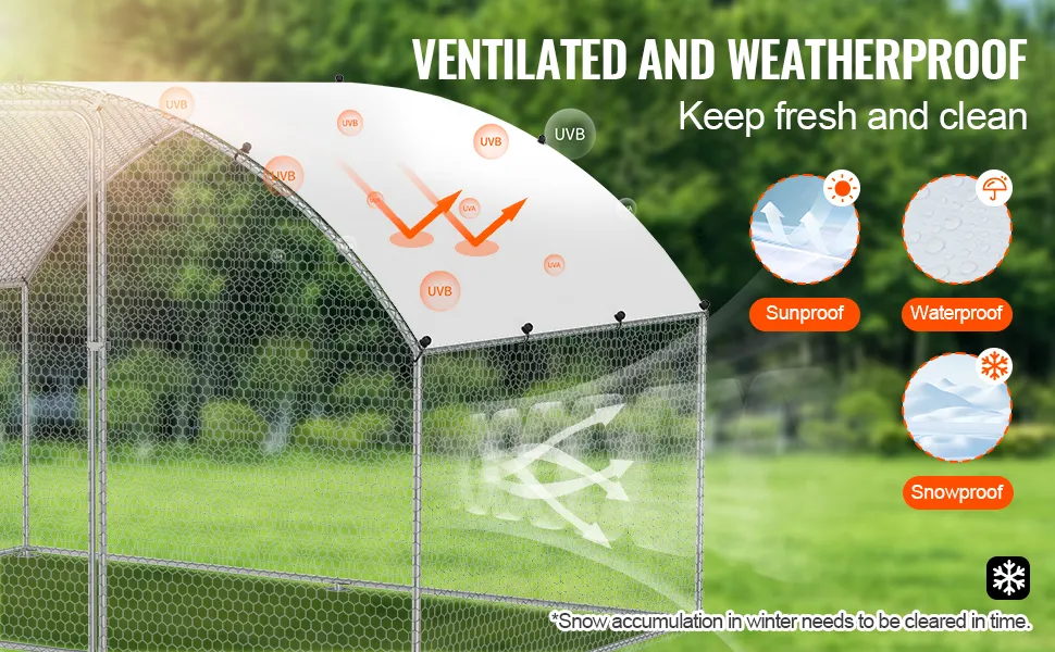 Il recinto per polli VEVOR di grandi dimensioni è progettato con ventilazione su quattro lati per ridurre la crescita batterica e gli odori. Ricordati di eliminare l'accumulo di neve in inverno per uno spazio di vita fresco e sano per il tuo pollame.