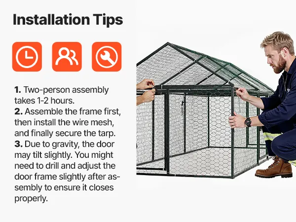 Facile da montare: la gabbia per pollame da esterno include tutti gli accessori necessari: guanti, picchetti a U e fascette. Il montaggio, che può essere eseguito da due persone, richiede circa 1-2 ore