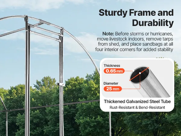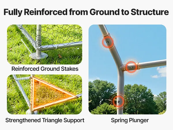 Telaio rinforzato in acciaio zincato: realizzato in acciaio zincato resistente alla corrosione e ancorato al terreno con picchetti per garantire stabilità. Questo recinto per polli è costruito per resistere a forti venti, forti nevicate