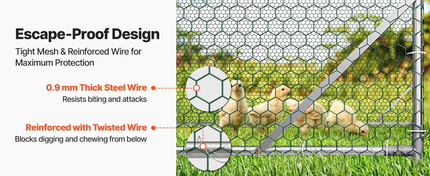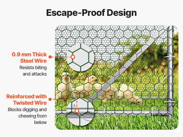 Rifugio migliorato: il nostro pollaio walk-in con rete metallica esagonale spessa fissata con fascette impedisce la fuga del pollame. Il fondo è dotato di rete metallica avvolta a spirale e di chiusure delle porte estese
