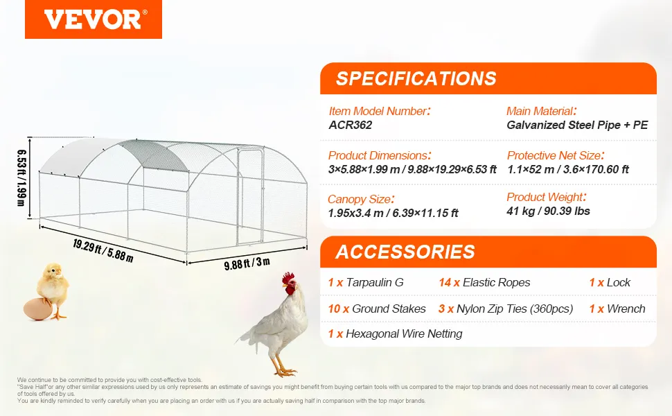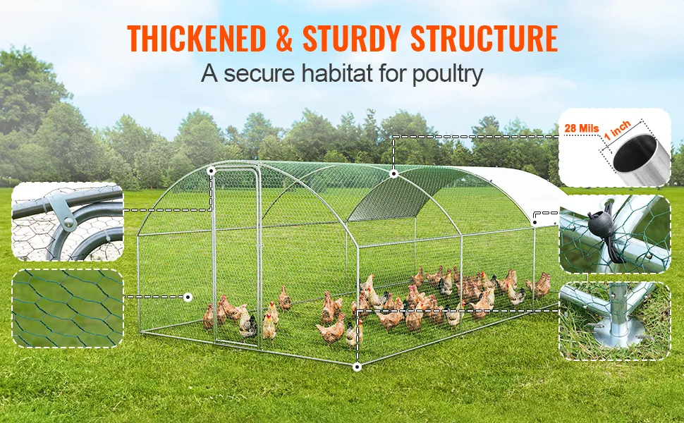 Il grande pollaio in metallo VEVOR offre un ambiente ampio e sicuro per il tuo pollame. Con dimensioni di 9,8x19,3x6,5 piedi, il pollaio offre abbastanza spazio per far razzolare i polli. Il robusto telaio in tubi di acciaio zincato assicura durevolezza e resistenza. Include una rete protettiva per tenere i tuoi uccelli al sicuro dai predatori. Questo grande pollaio in metallo è l'ideale per chi cerca una soluzione affidabile per l'alloggiamento all'aperto per le esigenze dei propri polli.