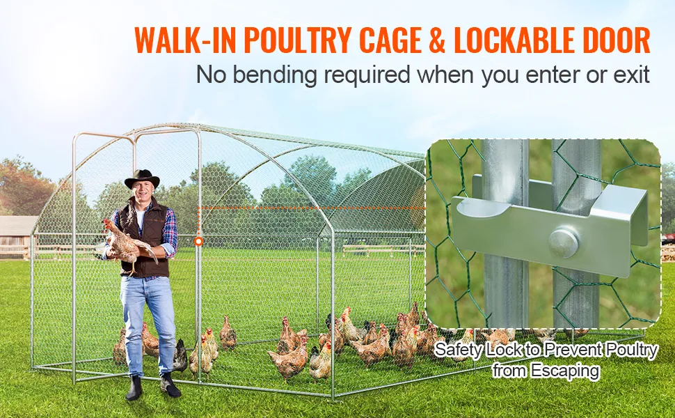 Il pollaio in metallo di grandi dimensioni VEVOR offre un facile accesso al tuo pollame. Il suo spazioso design walk-in consente un ingresso semplice nel tuo gregge. L'ampio spazio interno assicura che più polli possano girovagare comodamente. Con un tetto alto, puoi entrare senza piegarti, rendendolo semplice da pulire e mantenere. Questo design è ideale per coloro che desiderano un modo senza problemi per prendersi cura dei propri polli. L'interno spazioso semplifica anche l'aggiunta di mangiatoie, abbeveratoi e nidi.