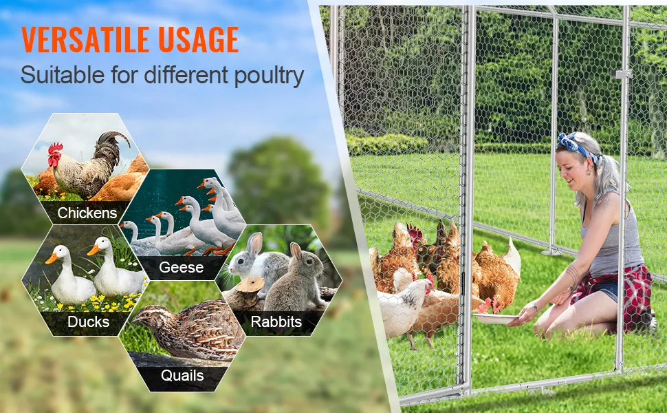 Puoi usare il pollaio in metallo grande VEVOR per vari scopi. Non è solo per i polli, ma anche per i conigli e altri piccoli animali. Può anche essere usato per proteggere il tuo giardino dai parassiti. La costruzione robusta assicura che il pollaio possa gestire vari usi senza compromettere la sicurezza. Questa versatilità lo rende un'ottima aggiunta a qualsiasi cortile o fattoria, offrendo molteplici soluzioni per le esigenze di alloggio e giardinaggio degli animali.