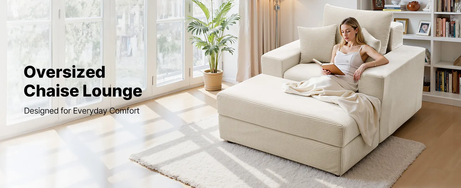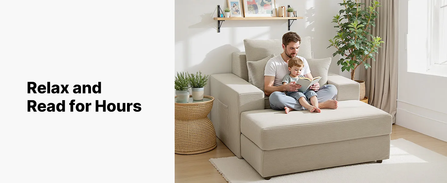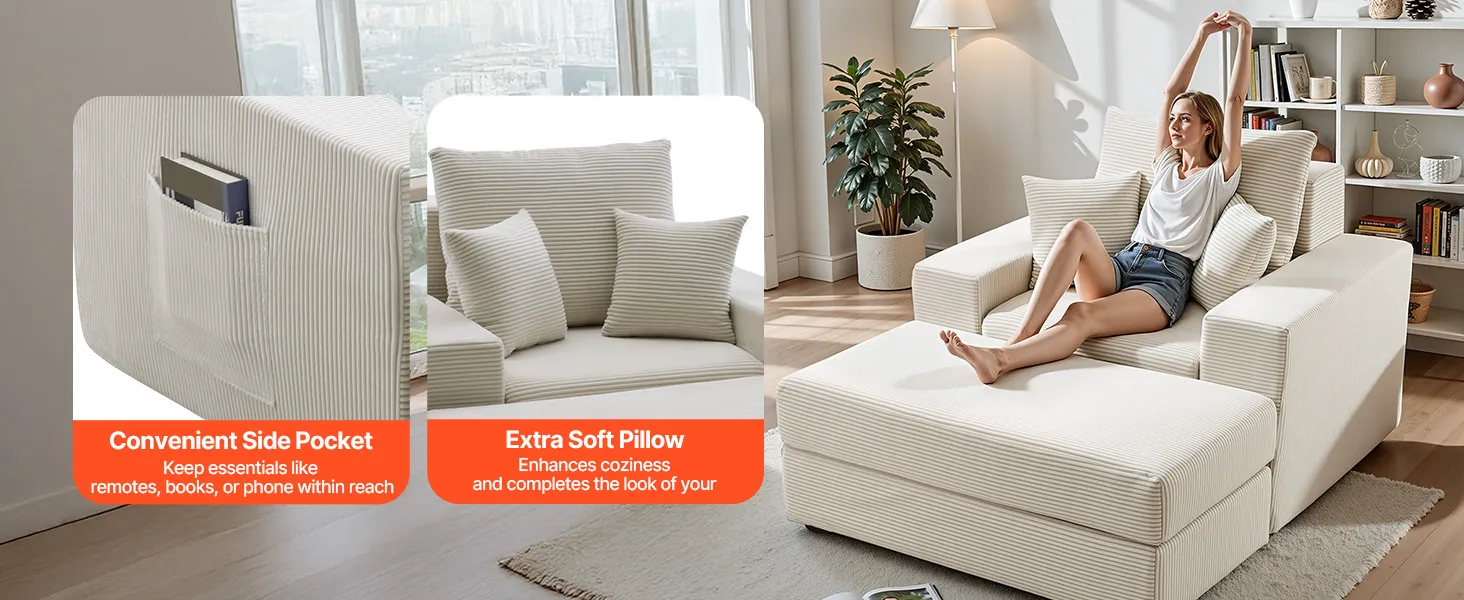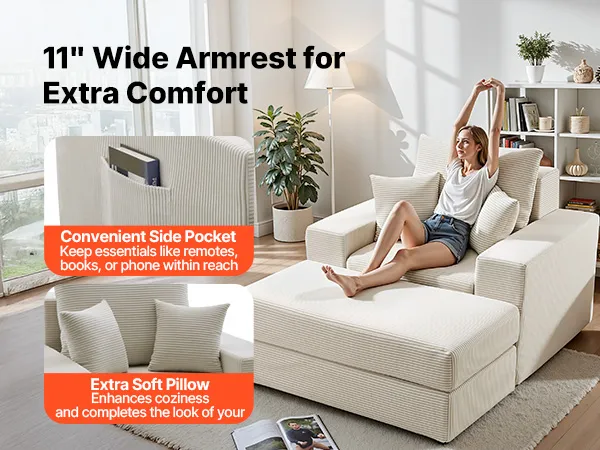 VEVOR Chaise Longue, Poltrona Modulare Senza Osso da 1115 mm per Interni, Sedia da Lettura Oversize in Velluto a Coste con Cuscini e Braccioli, Divano con Seduta Profonda per Soggiorno, Beige