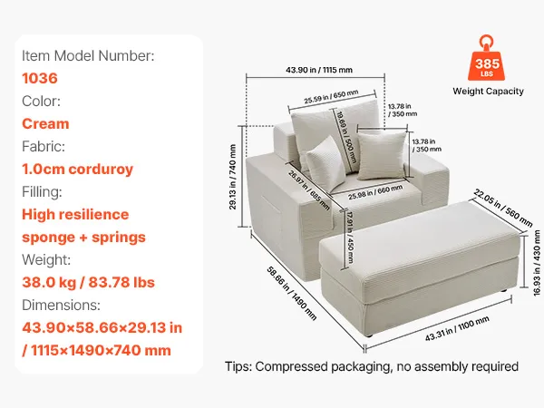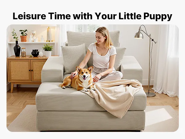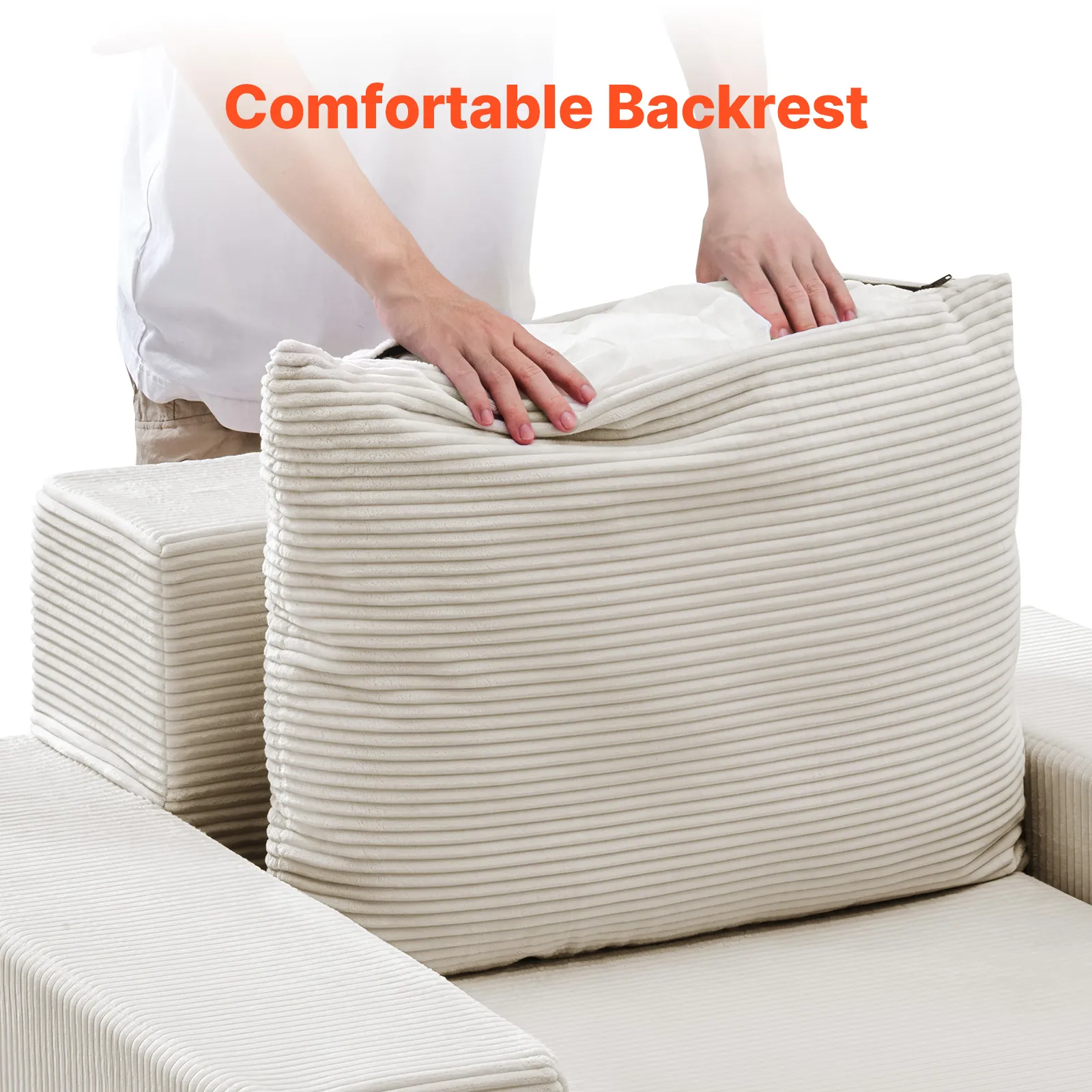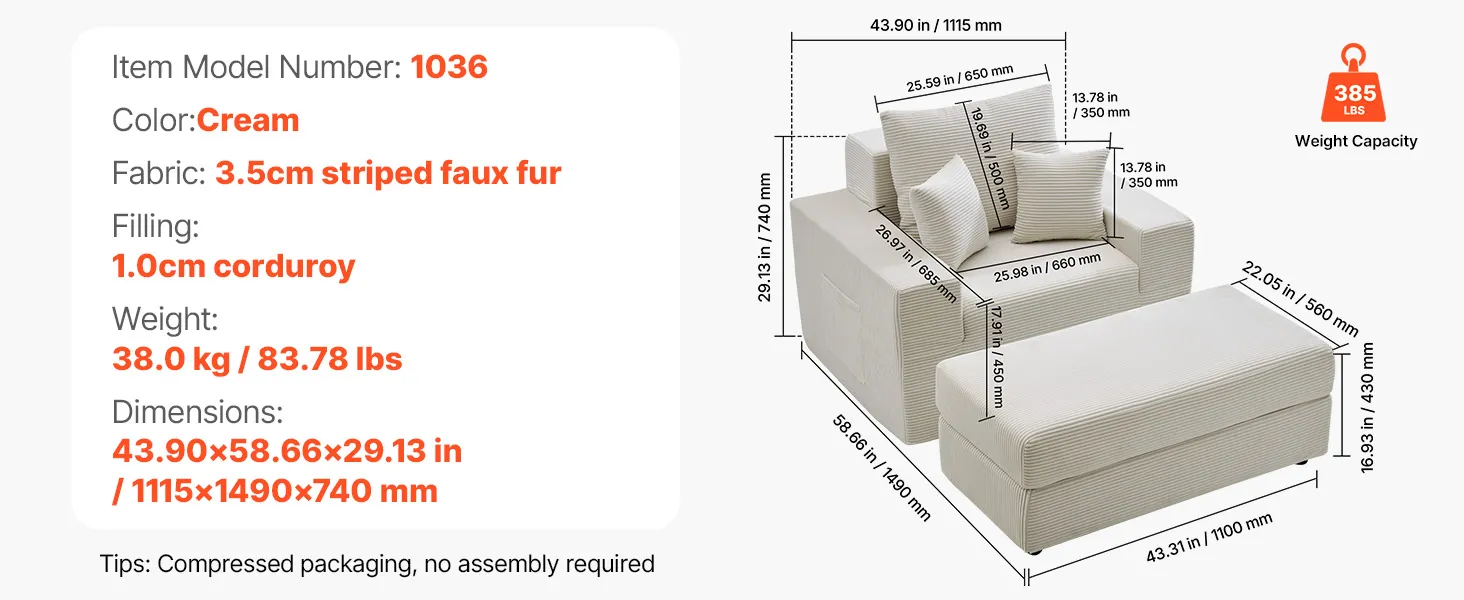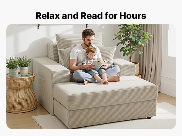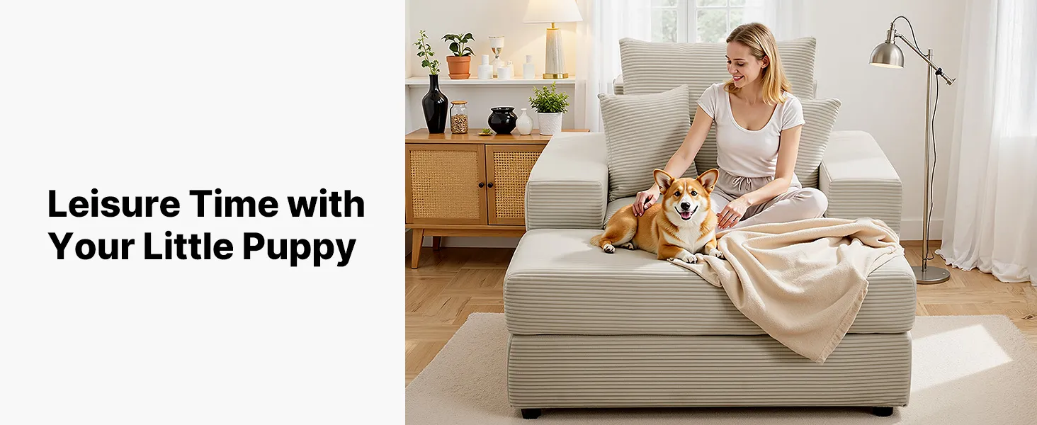 VEVOR Chaise Longue, Poltrona Modulare Senza Osso da 1115 mm per Interni, Sedia da Lettura Oversize in Velluto a Coste con Cuscini e Braccioli, Divano con Seduta Profonda per Soggiorno, Beige
