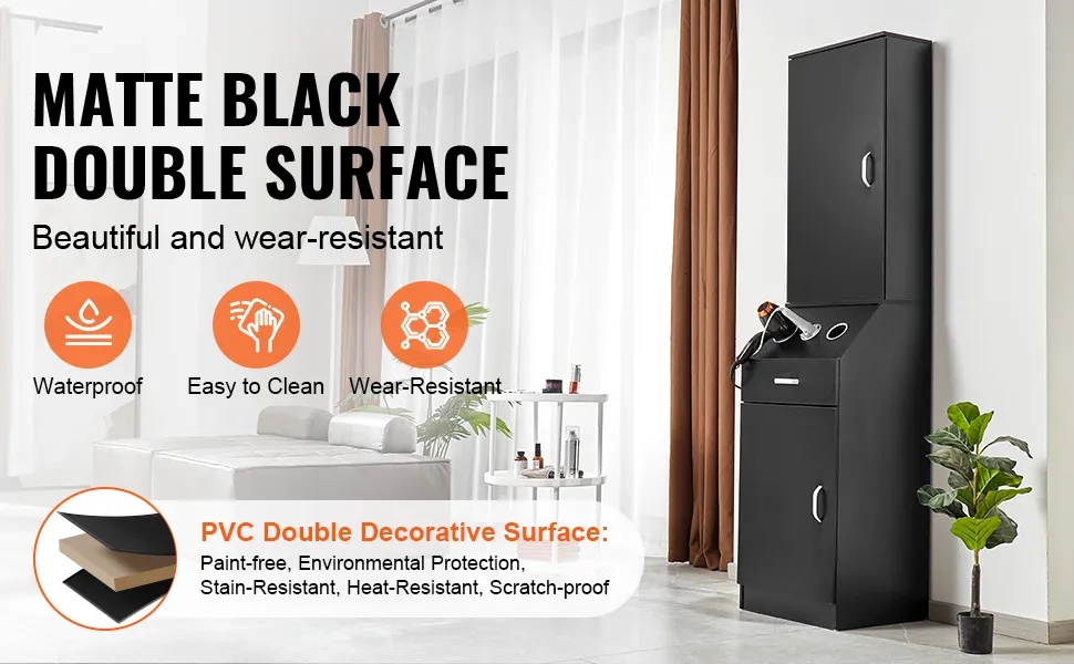 Materiale durevole: costruita con un pannello MDF ispessito e una doppia superficie decorativa in PVC nero opaco, la nostra postazione per parrucchieri è impermeabile e facile da pulire. Il suo design versatile si abbina a vari stili di arredamento d'interni, migliorandone l'estetica.