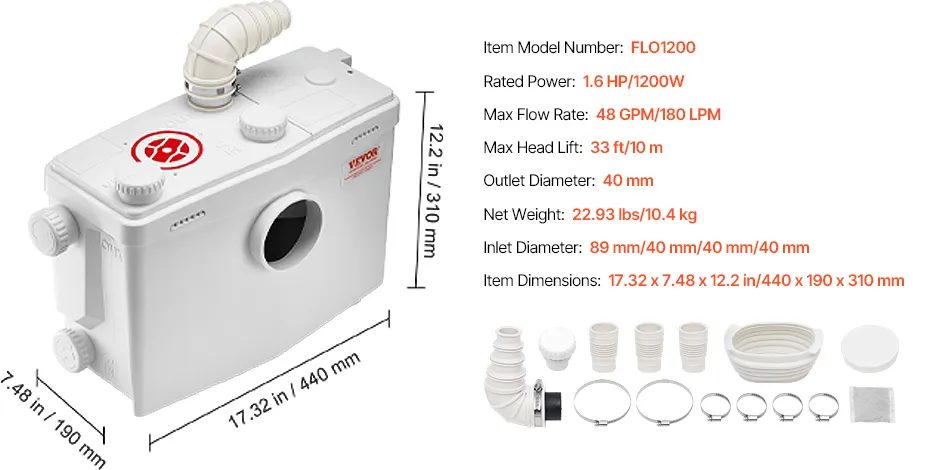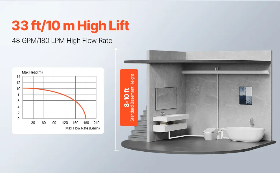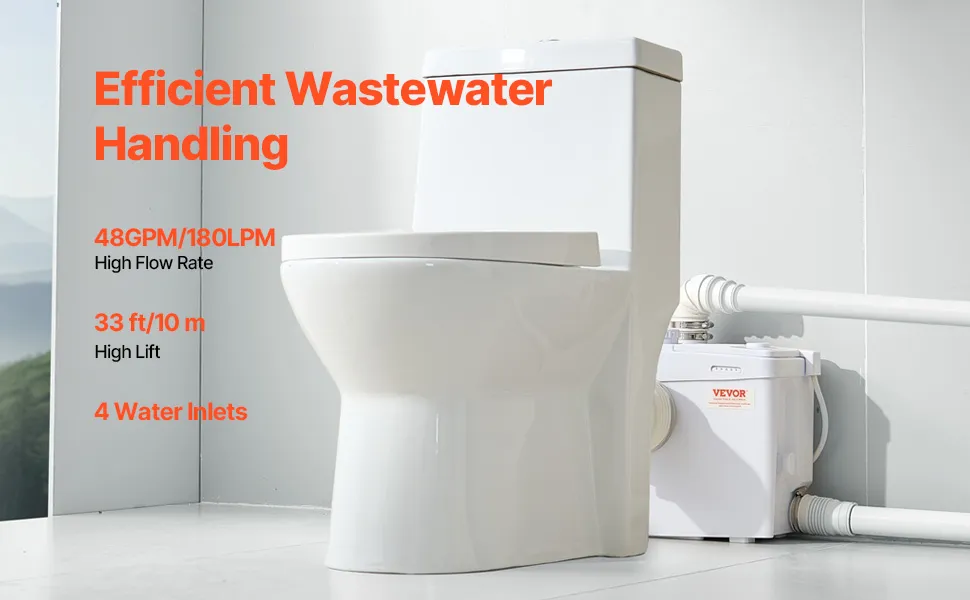Forte potenza di scarico: con un motore da 1,6 CV/1200 W e una portata di 48 GPM/180 LPM, questa pompa maceratrice assicura che il tuo water rimanga pulito, anche durante un uso intenso. La sua capacità di sollevamento di 33 piedi/10 m drena efficacemente le acque reflue, indipendentemente dalla disposizione dello spazio