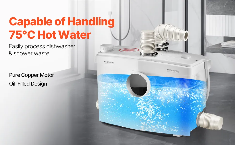 Dotata di un motore in rame e di un design riempito d'olio, questa pompa fognaria maceratrice gestisce facilmente le acque reflue fino a 75℃/167℉ provenienti da lavastoviglie e lavatrici.