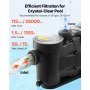High-Efficiency Filtration: With a 1100W max power, 15 m max head, 26,000 L/H max flow rate, 1150-3600 RPM variable speed control, and 3 preset modes, this in / above ground pool pump provides efficient filtration to keep your water crystal clear