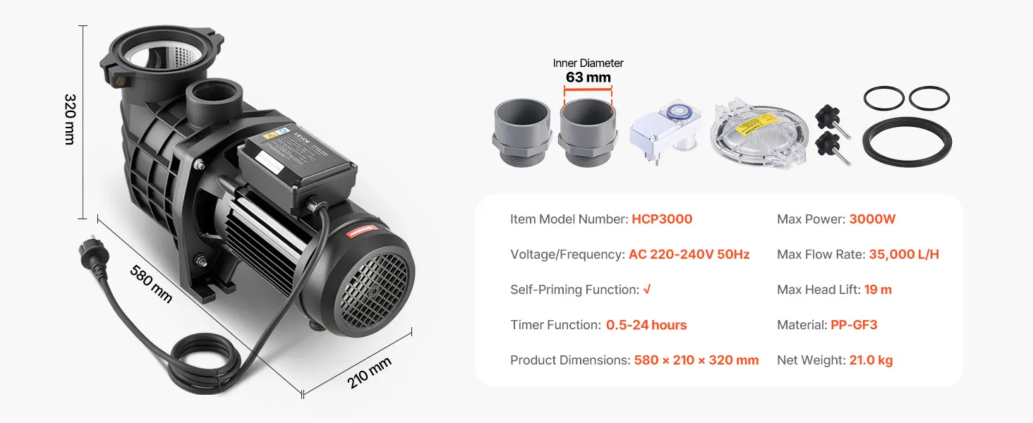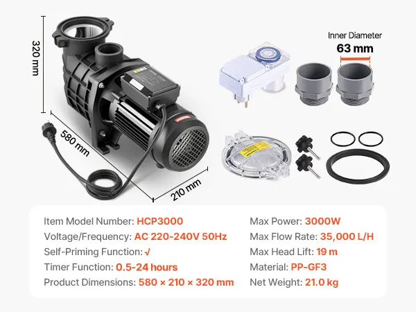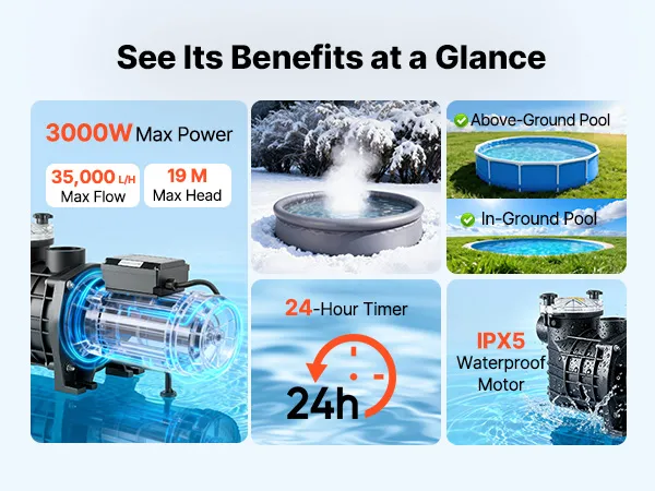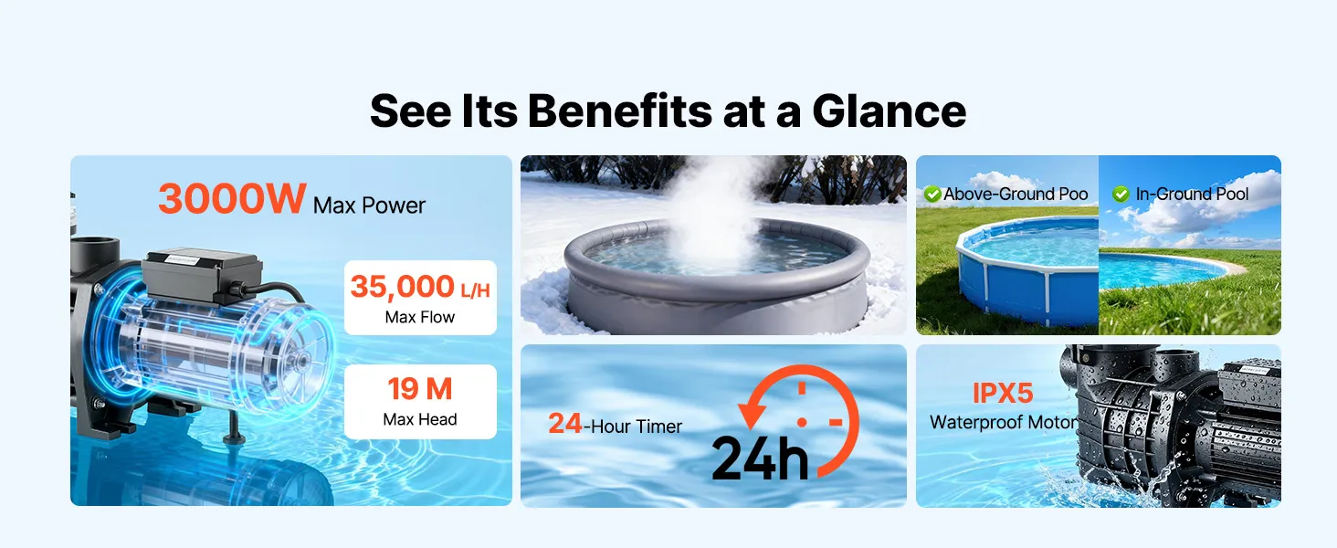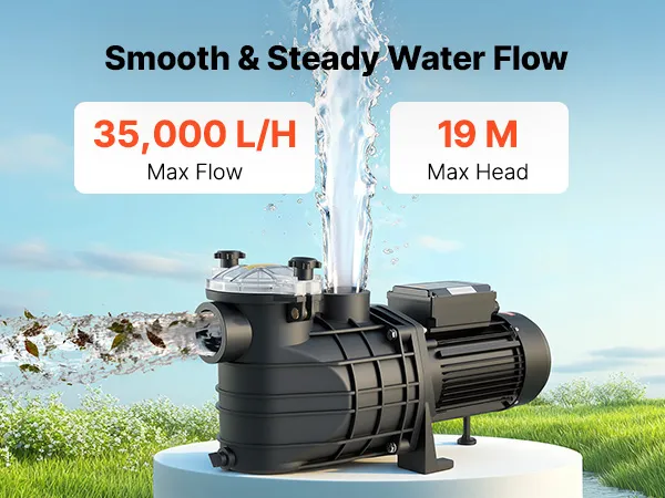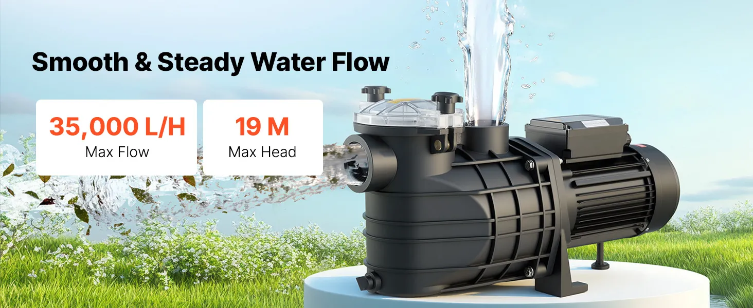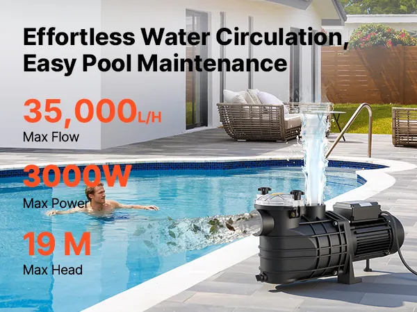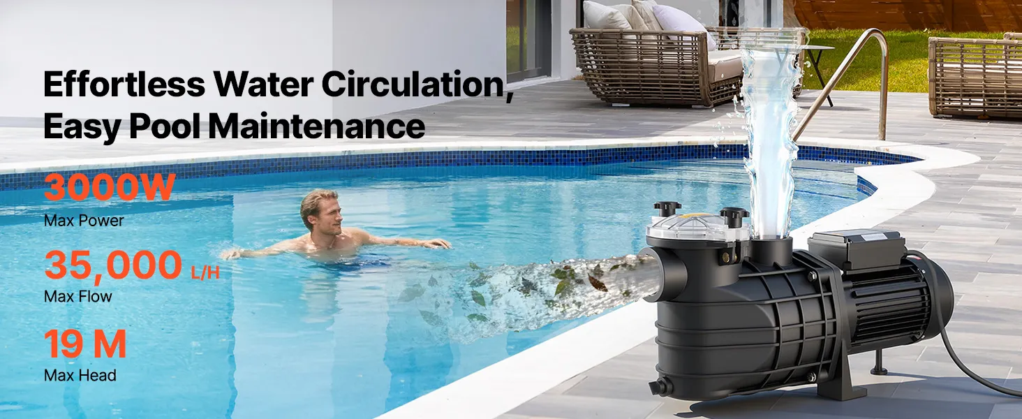Potente pompa per piscina da 3000 W: Questa pompa di filtrazione per piscina è dotata di un motore in rame per un funzionamento stabile, efficiente e silenzioso. Con una portata massima di 35.000 l/h e una prevalenza massima di 19 m