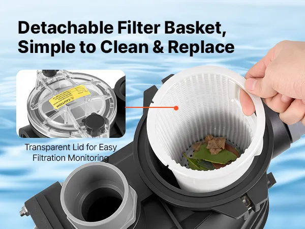 La nostra pompa di filtrazione per piscina è dotata di un cestello filtrante che prefiltra i detriti, proteggendo così la pompa e il sistema di filtrazione per un funzionamento ottimale.