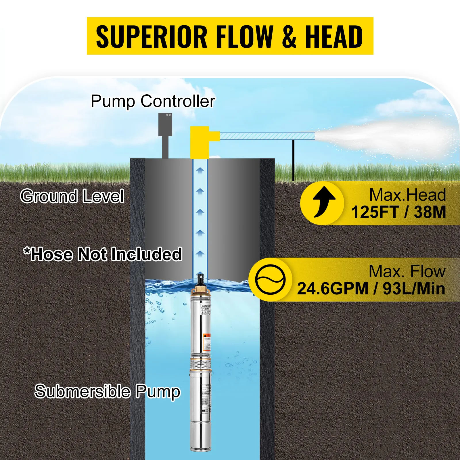 Il flusso massimo della pompa del pozzo sommergibile è di 24,6 GPM e la prevalenza massima è di 125 piedi, fornendo requisiti di pompa più elevati. Inoltre, la girante in acciaio fornisce grandi portate e sollevamenti per ottenere migliori prestazioni della pompa.