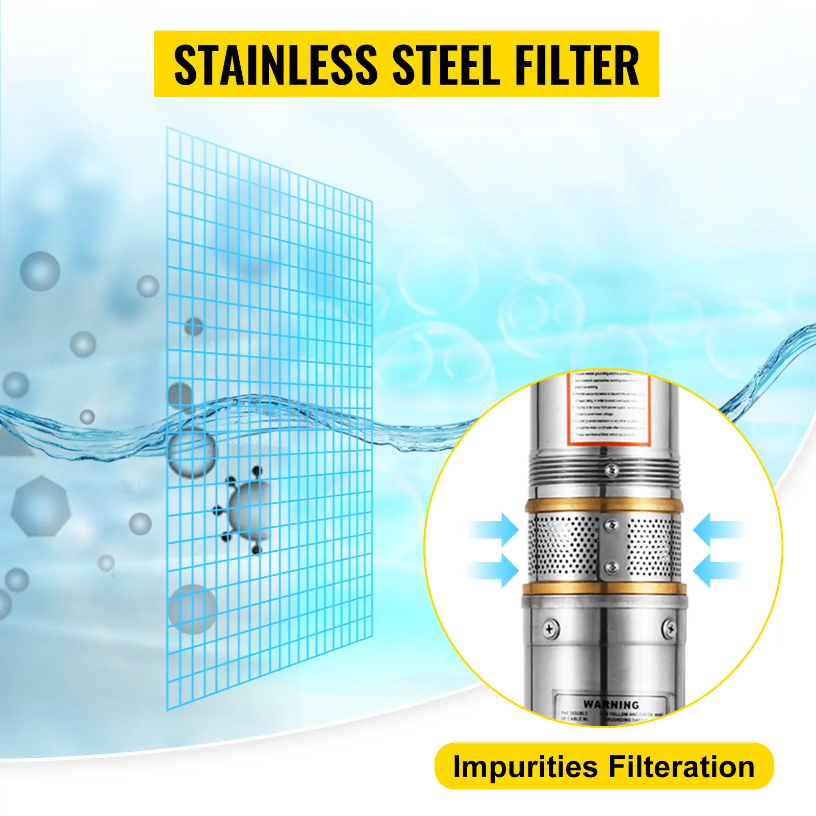 • Rete di Filtrazione Premium: la rete di filtrazione di una pompa sommergibile è realizzata in acciaio inossidabile per filtrare le impurità. È possibile aggiungere uno strato di garza davanti all'ingresso di filtrazione per un nuovo pozzo perforato con sedimento granulare eccessivo.