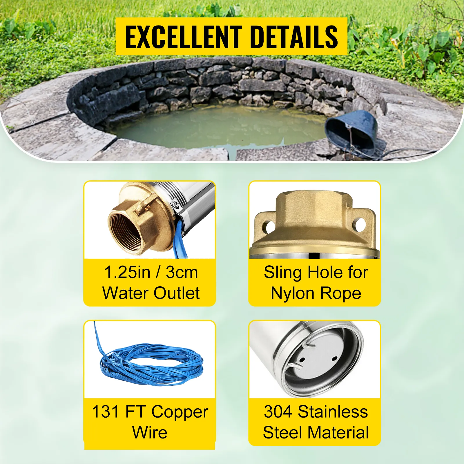 - Questa pompa sommergibile, realizzata in acciaio inossidabile 304, è una pompa da pozzo durevole che ti manterrà in uso per un paio d'anni. Inoltre, questa pompa per pozzi profondi fornisce una portata avanzata, producendo un flusso costante fino a una discreta profondità sotto la superficie. Con questa pompa per pozzi profondi, puoi ottenere acqua in modo rapido e conveniente anche da profondità maggiori.