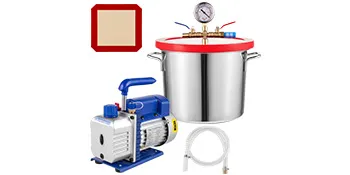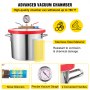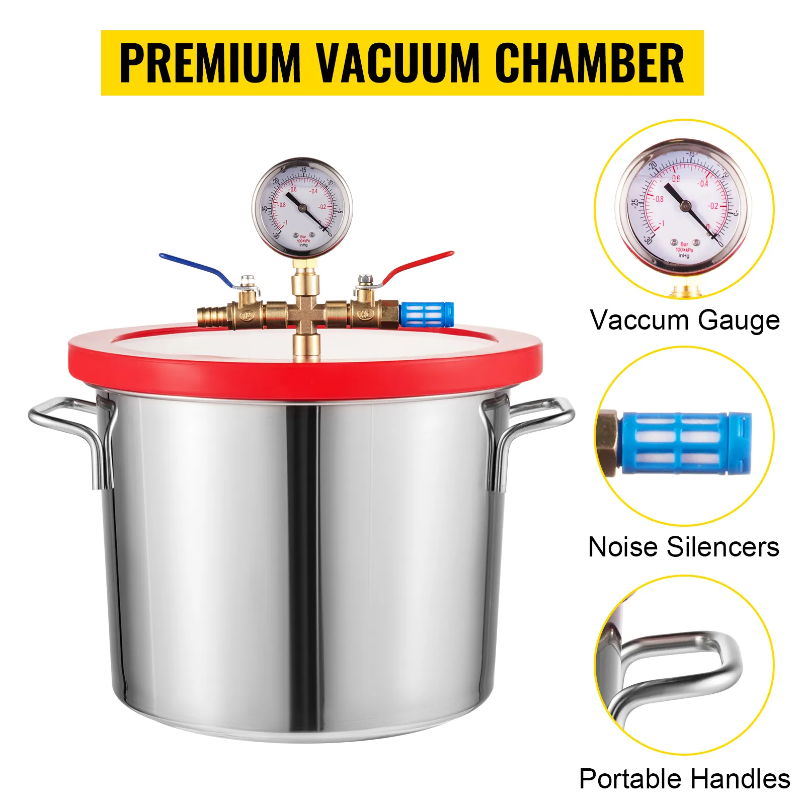 • Camera Sottovuoto di Alta Qualità: Capacità: 2 Gallone. La camera del vuoto in acciaio inossidabile è ad alta resistenza, può resistere fino a 160º F. È dotata di due silenziatori per ridurre il rumore e rendere la pompa più silenziosa. Il filtro dell'aria da 50 micron riduce il flusso d'aria nella camera per lo spurgo ed evita che i detriti entrino nella camera.
