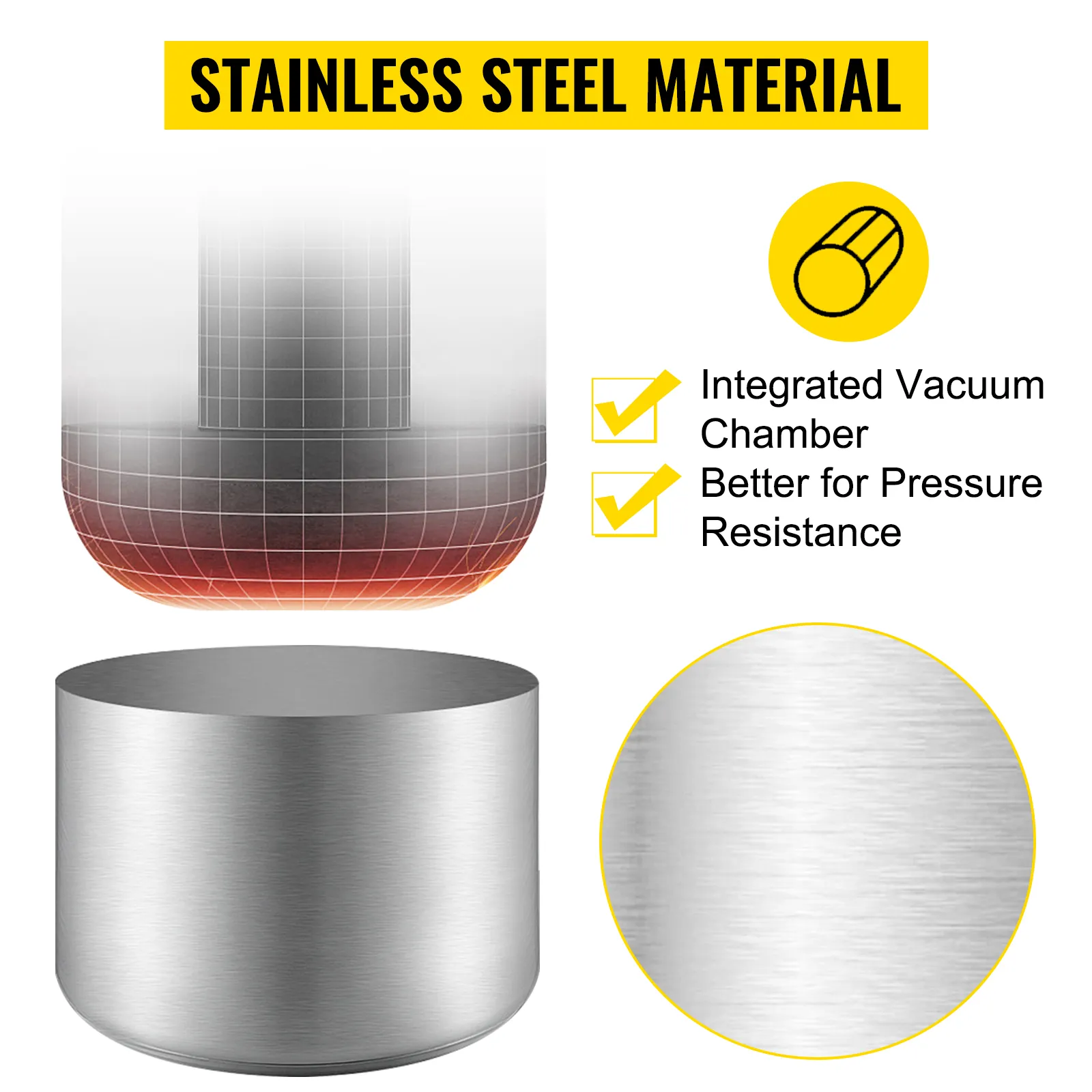 Questa camera a vuoto è realizzata in acciaio inossidabile ad alta resistenza con stampaggio monopezzo, molto resistente e può resistere fino a 160ºF, mantenendo il vuoto per lungo tempo. Supporta il livello di vuoto fino a 29,9 "Hg.