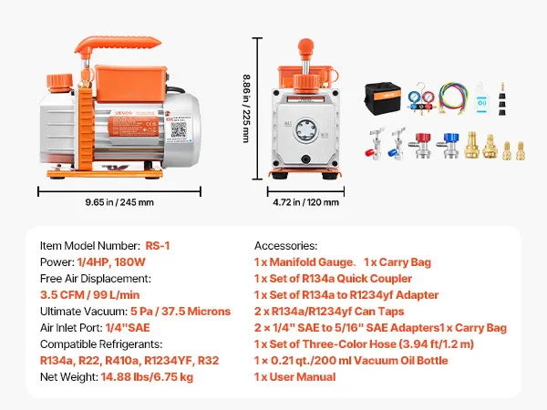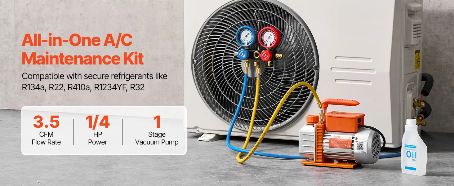 Dotato di una pompa per vuoto da 3,5 CFM 99 L/min, un vuoto limite di 5 Pa, un manometro ad alta precisione e un tubo flessibile tricolore, questo kit completo garantisce una manutenzione efficiente dei sistemi di aria condizionata e riscaldamento, ventilazione e condizionamento dell'aria (HVAC).