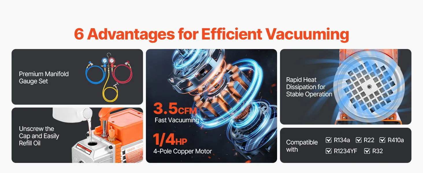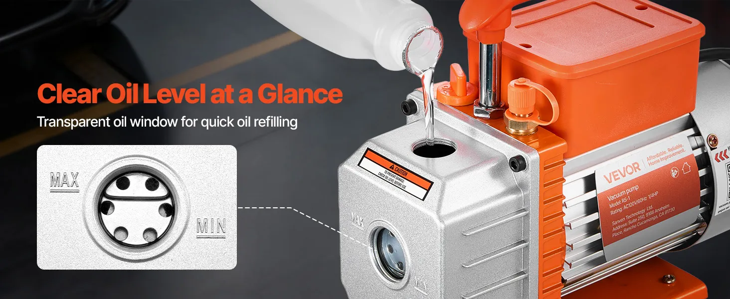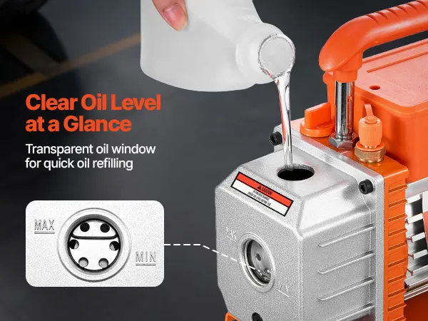 Prestazioni di vuoto eccezionali: dotata di un motore a 4 poli ad alta coppia, questa pompa monoblocco da 3,5 CFM e 99 L/min raggiunge un vuoto limite di soli 5 Pa. La sua capacità di olio integrata di 200 ml (0,21 qt)