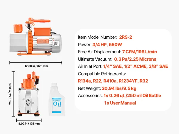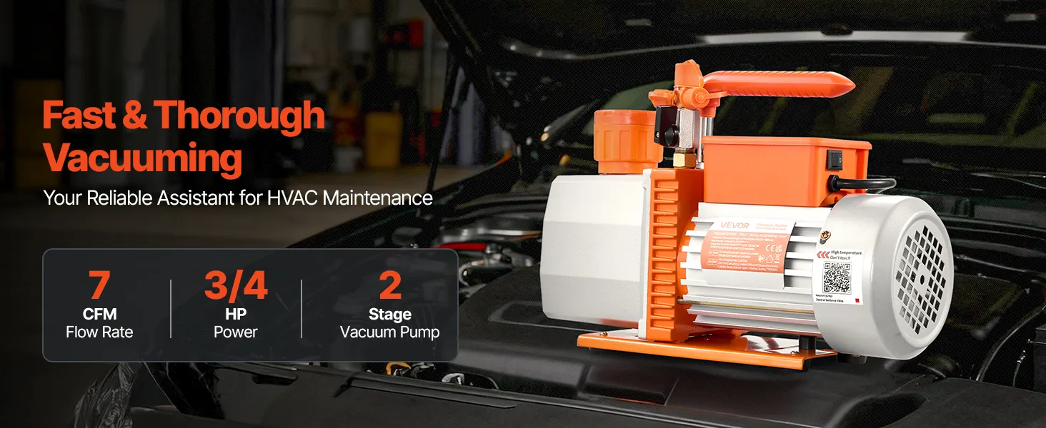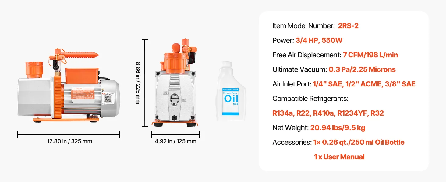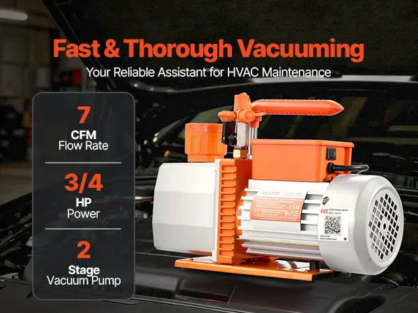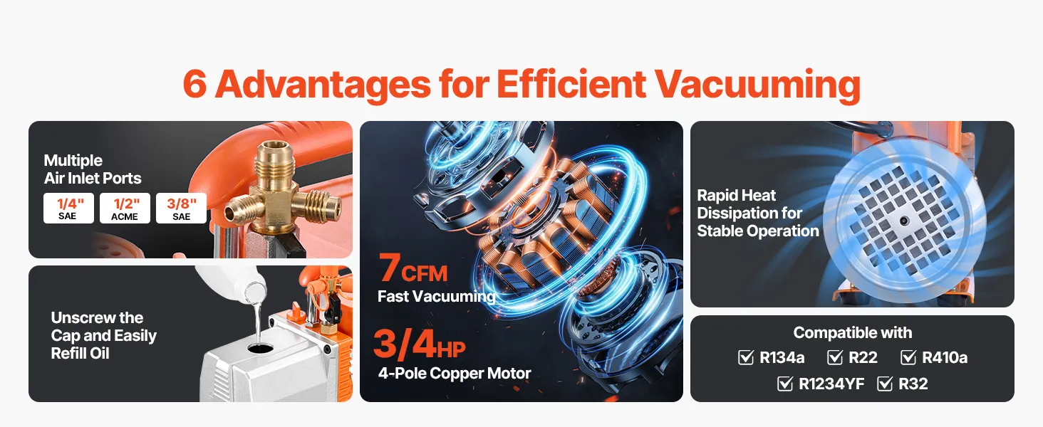 Aspirazione ad alta efficienza: questa pompa per vuoto a palette rotanti a due stadi è dotata di un robusto motore da 3/4 HP, che fornisce una portata di 7 CFM e un vuoto finale di 0,3 Pa. Ideale per la manutenzione HVAC