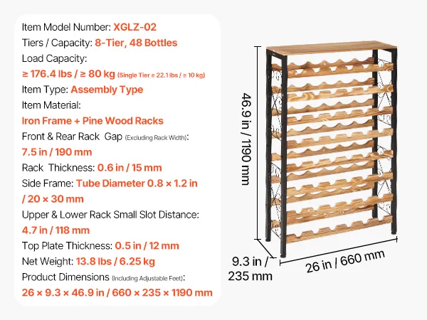 Questo portabottiglie autoportante in pino a 8 ripiani può contenere fino a 48 bottiglie. Grazie ai suoi spessi pannelli laterali e alla struttura robusta, è stabile e adatto a bottiglie di Bordeaux, Pinot Nero, Champagne e altre forme.