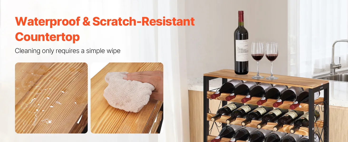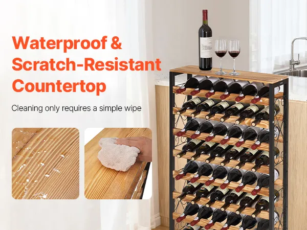 Spazio di stoccaggio: il portabottiglie da vino indipendente è dotato di una superficie di appoggio per un utilizzo ottimale dello spazio. La superficie è impermeabile, antigraffio e facile da pulire. Offre spazio per bicchieri da vino