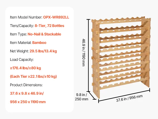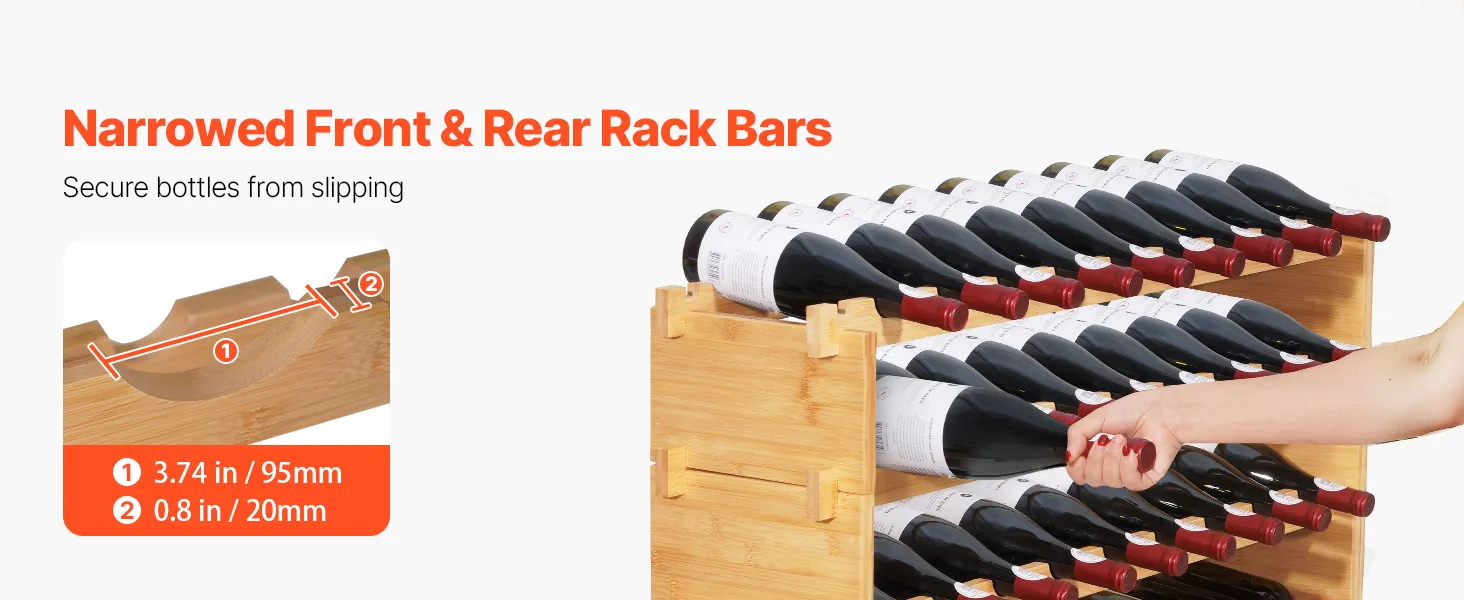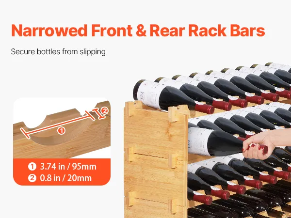 Ampia capacità: questo portabottiglie modulare e indipendente con 8 ripiani impilabili può contenere fino a 72 bottiglie. La sua lunghezza estensibile di 95,8 cm consente di posizionare senza problemi le bottiglie di Pinot Nero